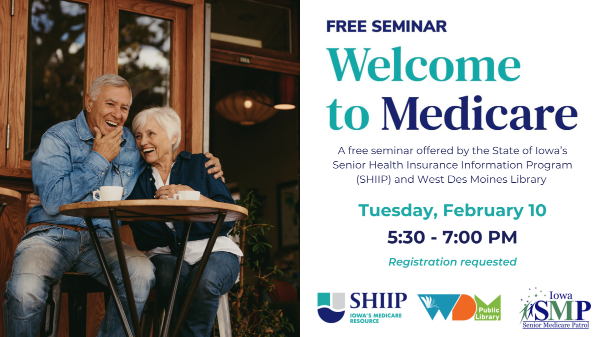 Are you going to be eligible for Medicare in the near future? Have you been on Medicare for awhile and want to better understand what it offers? Do you have a family member you help with Medicare issues? Please join us for a free Welcome to Medicare seminar alongside the State of Iowa's Senior Health Insurance Information Program (SHIIP). The seminar will cover basics about: Medicare Parts A & B, Prescription Drug Benefits, Medicare Advantage Plans, Medicare Supplement Insurance, and Medicare Fraud.