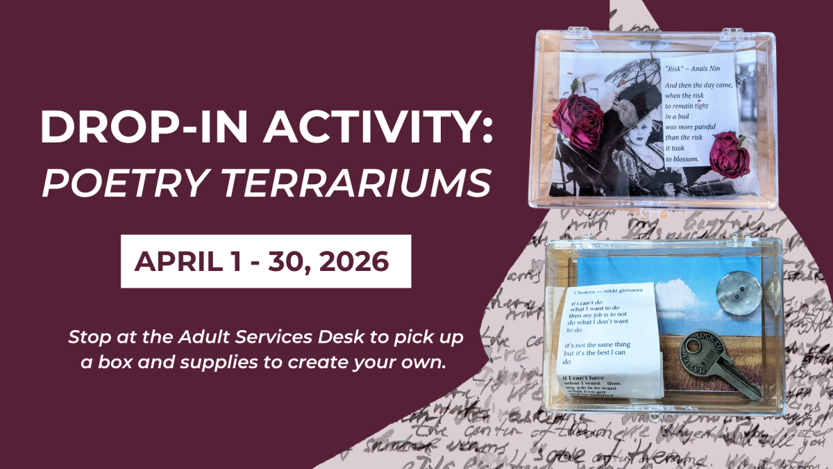 In April, we invite you to make your own Poetry Terrarium. Just what is a Poetry Terrarium? It combines snips of words and/or poetry in a small, clear box with tiny found objects (like keys or lego pieces). We supply the box, tiny objects and images, along with some selections of poetry (or you can write your own). All you need is your imagination!
